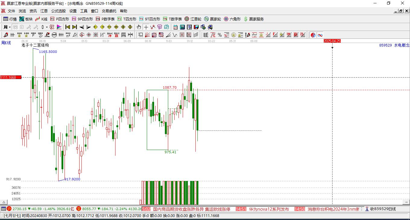 本周概念處于前期2024年9月20日形成的下跌結(jié)構(gòu)頂部線1281.23點(diǎn)上方,近期概念在此位置呈現(xiàn)震蕩走勢(shì),震蕩區(qū)間為1338.28-1447.06,本周收盤(pán)1394.79點(diǎn),微跌0.94%。依據(jù)贏家十二宮多空能量守恒規(guī)則,下跌結(jié)構(gòu)頂部線是多空能量轉(zhuǎn)換的關(guān)鍵位置,多方能量已連續(xù)釋放,空方能量不斷聚集。當(dāng)前概念若能站穩(wěn)上漲結(jié)構(gòu)頂部線1281.23,多方有望再一次發(fā)動(dòng)上攻,若跌破上漲結(jié)構(gòu)頂部線,則概念將會(huì)向下警戒線1196.99點(diǎn)位置附近尋找新的平衡位。