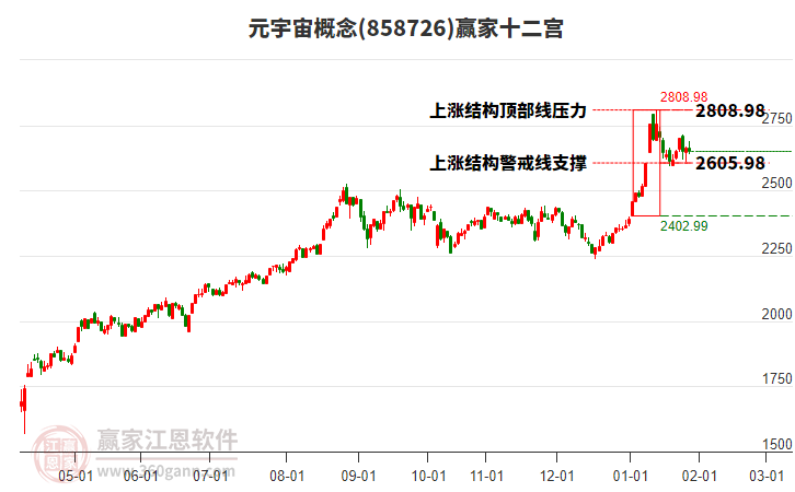 目前下穿12日前形成的上漲結(jié)構(gòu)警戒線2605.98點,自前期高點1月29日,至今日概念下跌146.22點,短期處于多空能量動態(tài)平衡,依據(jù)贏家十二宮多空能量守恒規(guī)則,上漲結(jié)構(gòu)警戒線是多空能量平衡爭奪點,突破或跌破往往意味著平衡打破。如確認(rèn)跌破警戒線,多空能量平衡或?qū)⒋蚱?,同時空方將成為主導(dǎo),向下方結(jié)構(gòu)底部線2402.99點尋找新的能量平衡位。若快速收復(fù)警戒線,則多空能量可能再次展開反復(fù)爭奪。
