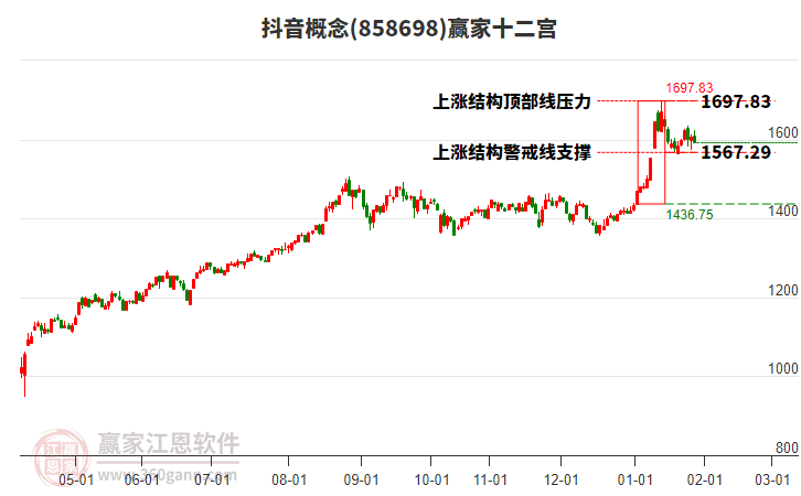 概念自近期高點(diǎn)1643.04跌至今日1575.59點(diǎn),共下跌67.45點(diǎn),跌幅4.28%,當(dāng)前概念處于2026年1月15日形成的上漲結(jié)構(gòu)頂部線(xiàn)與警戒線(xiàn)之間。依據(jù)贏(yíng)家十二宮多空能量守恒規(guī)則,若多方能量再度聚集發(fā)力上攻,有望再度上攻關(guān)注結(jié)構(gòu)頂部線(xiàn)1697.83點(diǎn)尋找平衡位;若跌破警戒線(xiàn),空方繼續(xù)主導(dǎo),則將進(jìn)一步下探結(jié)構(gòu)底部線(xiàn)1436.75點(diǎn)尋找平衡位。