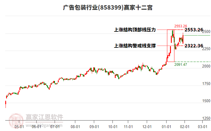 行業(yè)自近期低點(diǎn)2262.6,漲至今日2384.16,共上漲121.56點(diǎn),漲幅5.37%,當(dāng)前行業(yè)處于2026年1月15日形成的上漲結(jié)構(gòu)頂部線與警戒線之間。依據(jù)贏家十二宮多空能量守恒規(guī)則,多方能量占據(jù)主導(dǎo)地位,上方平衡位置關(guān)注結(jié)構(gòu)頂部線2553.26點(diǎn)。