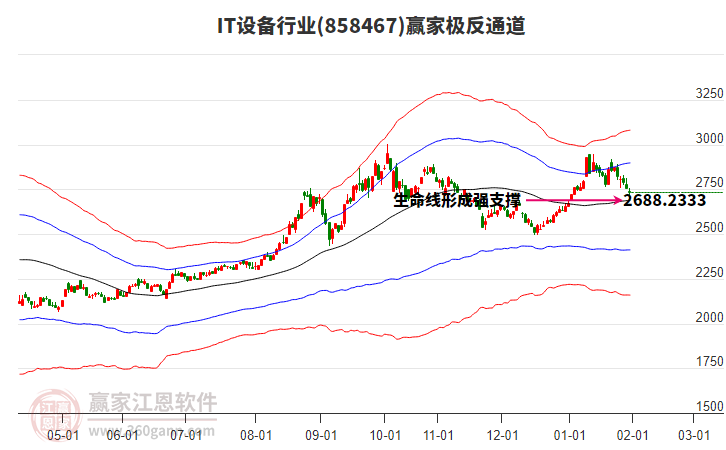 行業(yè)于1月22日高點2917.69,展開一波下跌,今日跌破生命線2690.913點,進(jìn)入弱勢通道, 依據(jù)極反通道規(guī)則,失守一線,看低一線,短期走弱,若此處不能收復(fù)生命線,則繼續(xù)下探至弱勢通道線附近尋找支撐。