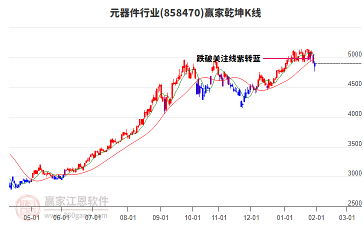 目前行業(yè)處于藍(lán)色區(qū)域(下跌趨勢),今天行業(yè)以上影中陰線收盤,K線收于出局線下方。近期波段低點(diǎn)為1月30日4760.76點(diǎn),若跌破前期低點(diǎn)4760.76,將形成短期下行趨勢,如短期行業(yè)快速進(jìn)入紅色區(qū)域,有望走出震蕩區(qū)域。