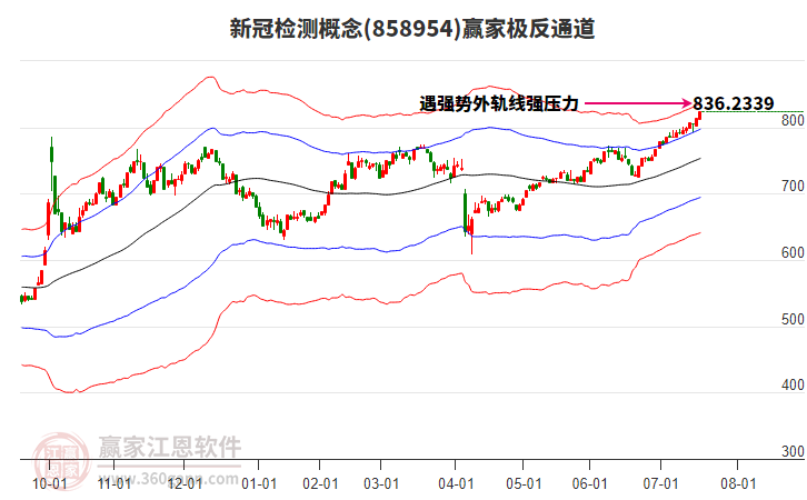 今天概念處在超強通道,自近期6月23日725.45點漲至今日837.95,歷經(jīng)20日,目前受強勢外軌線841.5948點壓制,依據(jù)極反通道規(guī)則,一線不過,看低一線。當前概念如能突破站穩(wěn)強勢外軌線,會進一步打開上漲空間,若不能有效突破強勢外軌線,則可能回調向下在強勢通道線802.5942點附近尋找支撐。