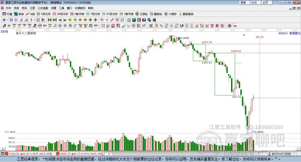 概念自2月5日低點713.46展開上攻,持續(xù)4日,抵達江恩輪三角形關(guān)鍵位置871.22點壓力位附近受阻,以856.67點收盤,依據(jù)贏家江恩輪中輪規(guī)則,市場中三分位、四分位是一切市場周期運行的基礎(chǔ),若能繼續(xù)有效突破三角形關(guān)鍵位置871.22,有望持續(xù)看多至四方形關(guān)鍵位置886.11點。