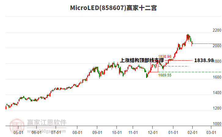 當(dāng)前處于38天前形成的贏家十二宮上漲結(jié)構(gòu)頂部線1838.98點(diǎn)上方,目前此位置由前方高點(diǎn)1月26日下跌至今日,跌幅3.22%。依據(jù)贏家十二宮結(jié)構(gòu)規(guī)則,若跌破頂部線,多方能量持續(xù)衰減,上漲動(dòng)能不足,空方能量占據(jù)主導(dǎo),向下警戒線1764.26點(diǎn)尋找多空能量平衡位。
