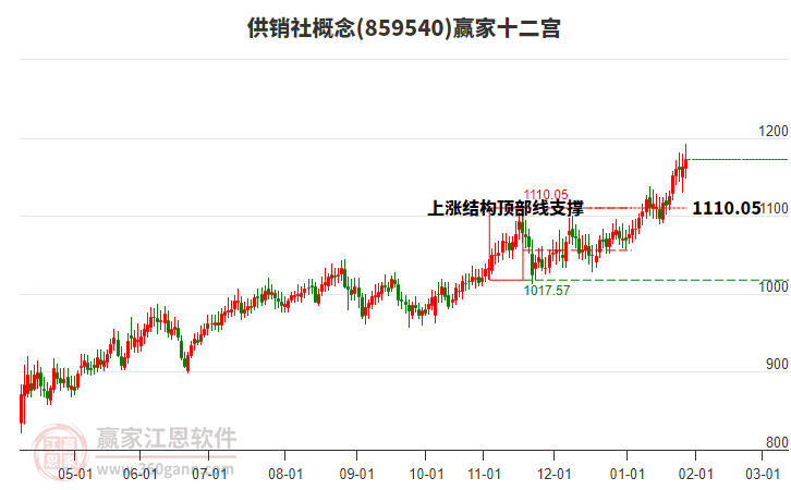 當(dāng)前處于53天前形成的贏家十二宮上漲結(jié)構(gòu)頂部線1110.05點上方,目前此位置由前方高點1月29日下跌至今日,跌幅5.56%。依據(jù)贏家十二宮結(jié)構(gòu)規(guī)則,若跌破頂部線,多方能量持續(xù)衰減,上漲動能不足,空方能量占據(jù)主導(dǎo),向下警戒線1055.72點尋找多空能量平衡位。