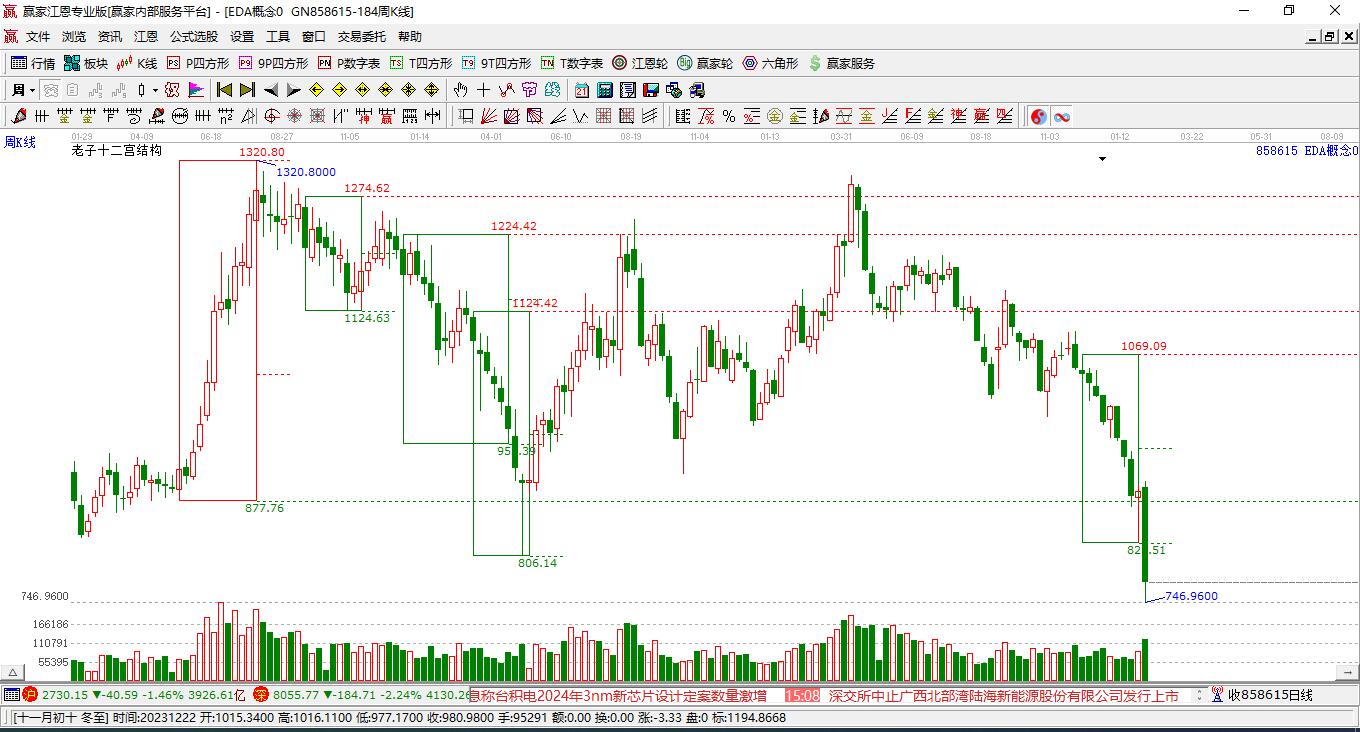 本周概念微跌2.76%,跌破贏家江恩輪中輪四方形關(guān)鍵位置1752.98點。依據(jù)贏家江恩輪中輪規(guī)則,市場中圓形、三角形、四方形是一切市場周期運行的基礎(chǔ)。若不能快速收復(fù)四方形關(guān)鍵位置,則注意下方三角形關(guān)鍵支撐位1702.75點,若能再次站穩(wěn)四方形關(guān)鍵位置,則關(guān)注上方三角形壓力位1903.65點。