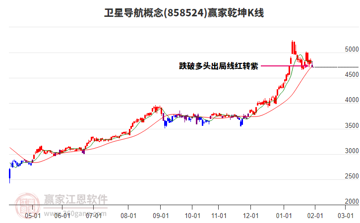 當(dāng)天概念以下影陰十字星收盤,當(dāng)前跌破關(guān)注線,由紫色區(qū)域進(jìn)入藍(lán)色區(qū)域(下跌趨勢(shì)),依據(jù)贏家江恩乾坤K線多空模型,此信號(hào)往往預(yù)示著波段開始走弱,后續(xù)如保持在空頭出局線下方運(yùn)行以看空為主,一旦突破空頭出局線預(yù)示短線有望走強(qiáng)迎來反彈。