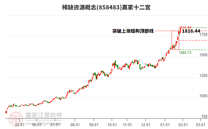 目前概念跌破上漲結(jié)構(gòu)頂部線1816.44點(diǎn),概念自前方高點(diǎn)1月29日1919.99點(diǎn)持續(xù)下跌1日跌幅8.62%,依據(jù)贏家十二宮結(jié)構(gòu)規(guī)則,上漲結(jié)構(gòu)突破頂部線后再次跌落至頂部線,多空能量再次在頂部線尋找平衡。若確認(rèn)跌破頂部線,出現(xiàn)空方能量守恒狀態(tài),向下警戒線1701.08點(diǎn)尋找多空能量平衡位。