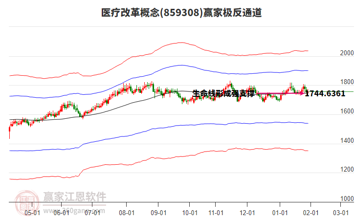 概念于1月14日高點1819.21,展開一波下跌,今日跌破生命線1744.689點,進入弱勢通道, 依據(jù)極反通道規(guī)則,失守一線,看低一線,短期走弱,若此處不能收復(fù)生命線,則繼續(xù)下探至弱勢通道線附近尋找支撐。