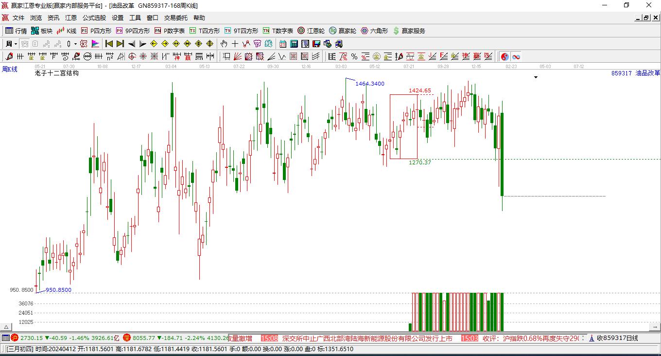 當(dāng)前處于27周前形成的贏家十二宮上漲結(jié)構(gòu)頂部線1467.12點(diǎn)上方,目前此位置由前方低點(diǎn)12月19日上攻至本周,漲幅達(dá)27.41%。依據(jù)贏家十二宮結(jié)構(gòu)規(guī)則,若跌破頂部線,多方能量持續(xù)衰減,上漲動能不足,空方能量占據(jù)主導(dǎo),向下警戒線1361.67點(diǎn)尋找多空能量平衡位。