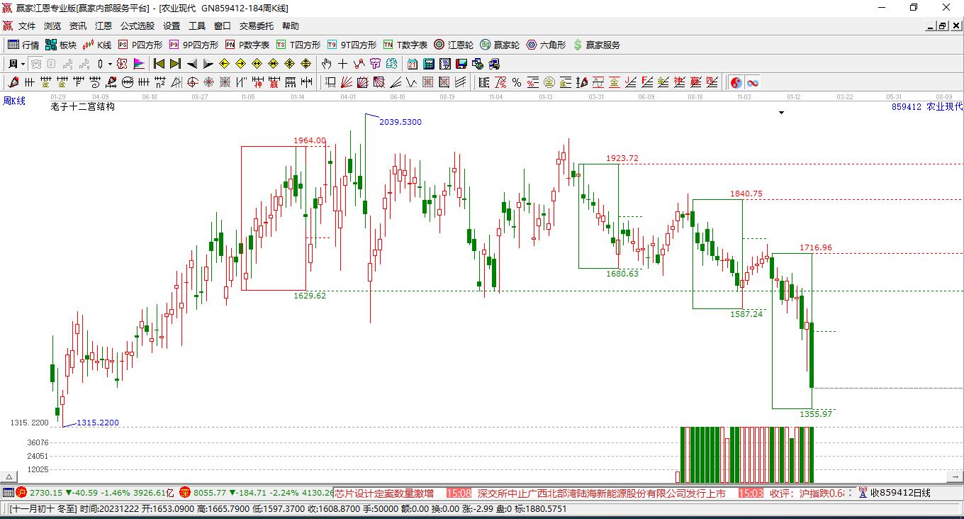 當(dāng)前處于22周前形成的贏家十二宮上漲結(jié)構(gòu)頂部線2034.52點(diǎn)上方,目前此位置由前方低點(diǎn)4月11日上攻至本周,漲幅達(dá)37.68%。依據(jù)贏家十二宮結(jié)構(gòu)規(guī)則,若跌破頂部線,多方能量持續(xù)衰減,上漲動(dòng)能不足,空方能量占據(jù)主導(dǎo),向下警戒線1860.12點(diǎn)尋找多空能量平衡位。