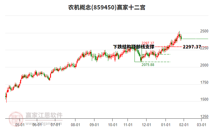 當前處于59天前形成的贏家十二宮上漲結(jié)構(gòu)頂部線2326.55點上方,目前此位置由前方高點1月26日下跌至今日,跌幅6.43%。依據(jù)贏家十二宮結(jié)構(gòu)規(guī)則,若跌破頂部線,多方能量持續(xù)衰減,上漲動能不足,空方能量占據(jù)主導,向下警戒線2217.82點尋找多空能量平衡位。
