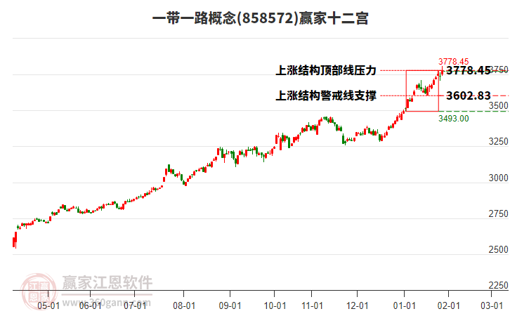 概念自近期低點3283.04,漲至今日3741.59,共上漲458.55點,漲幅13.97%,當(dāng)前概念處于2026年1月29日形成的上漲結(jié)構(gòu)頂部線與警戒線之間。依據(jù)贏家十二宮多空能量守恒規(guī)則,多方能量占據(jù)主導(dǎo)地位,上方平衡位置關(guān)注結(jié)構(gòu)頂部線3807.62點。