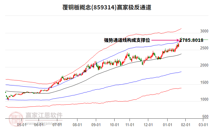 今日K線以上下影小陽線收盤,收盤價(jià)2807.77,概念自1月15日低點(diǎn)2432.97展開上攻,持續(xù)11日,抵達(dá)強(qiáng)勢(shì)通道線2863.0364點(diǎn)壓力位附近受阻,如能有效突破強(qiáng)勢(shì)通道線,則有望繼續(xù)上攻強(qiáng)勢(shì)外軌線3234.427點(diǎn),若不能突破則將回探生命線2437.7063點(diǎn)附近尋找支撐。極反通道規(guī)則顯示,一線受阻,回調(diào)一線。