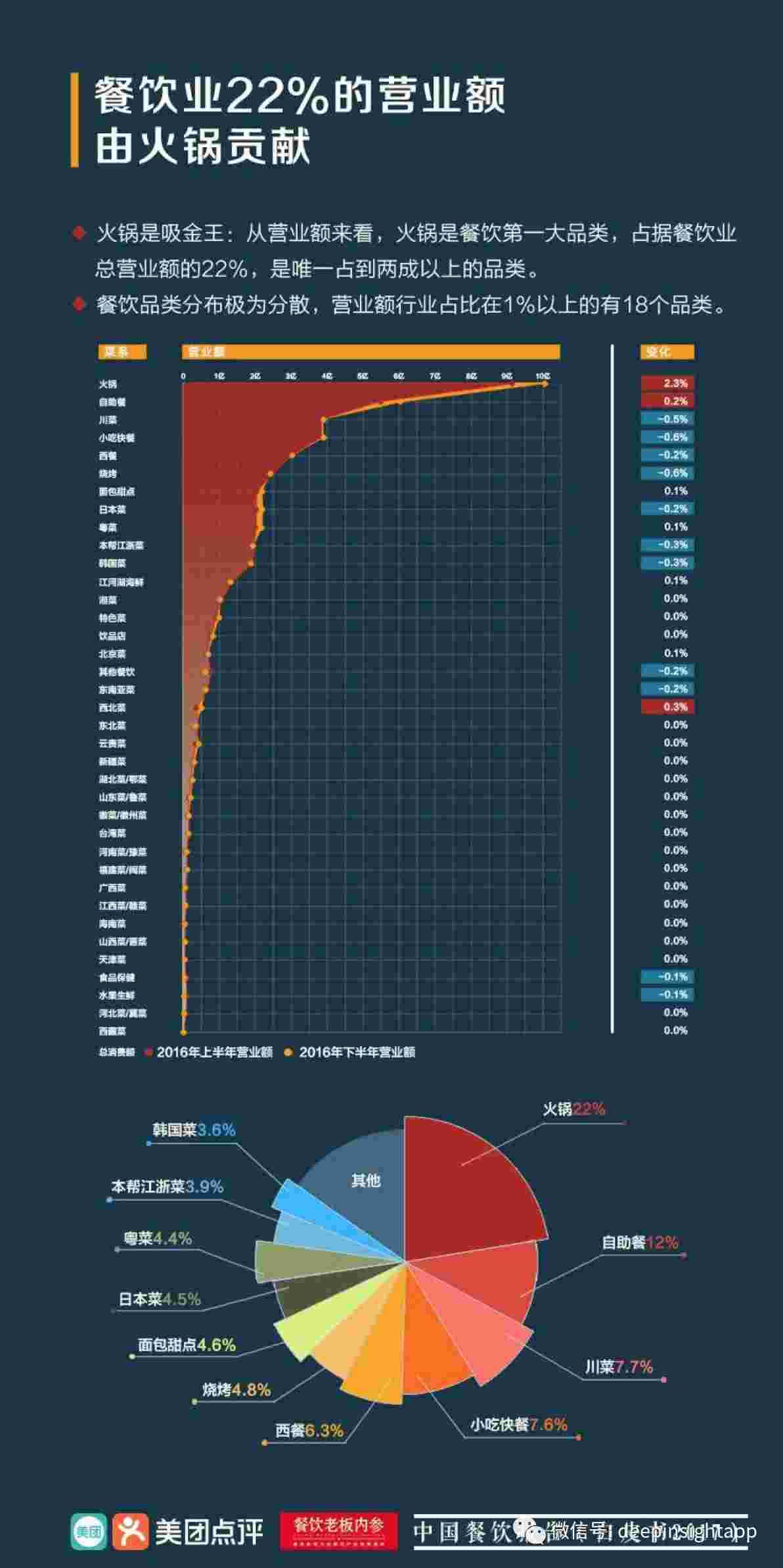 導(dǎo)讀:中國素來為飲食大國,川、魯、粵、閩、蘇、浙、湘、徽,“八大菜系”各領(lǐng)風(fēng)騷。由于人口眾多,天生有對美食有喜好,中國的餐飲市場先天具有很好的發(fā)展土壤。然而就是在這個以講究吃著名的國度,在餐飲行業(yè)中最為火熱的品類卻是最不講究烹飪技術(shù)的大雜燴——火鍋。根據(jù)《中國餐飲報告》(白皮書2017)數(shù)據(jù)顯示,2016年占餐飲業(yè)總營業(yè)額22%的火鍋名列榜首,超過排名第二的自助餐近一倍。火鍋,到底是不是一門好生意呢?