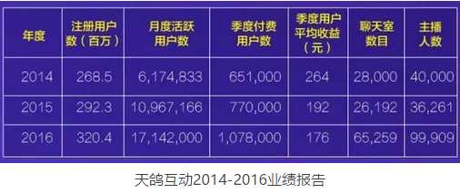 數據就是最好的例證。天鴿互動發(fā)布的2017年第一季度財報顯示,受惠于移動直播以及集團多元化建設,截至2017年3月31日,天鴿收入2.44億元,較去年同期1.52億元增長61.0%。季度付費用戶(QPUs)131.4萬人,同比增長65.7%。其中,主播109617位,同比增長204.2%。