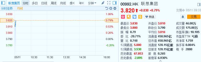 聯(lián)想集團(tuán)漲0.79%,報3.82港元。聯(lián)想集團(tuán)、聯(lián)想控股盤前分別漲0.5%、0.4%。此前騰訊稱聯(lián)想否認(rèn)5G標(biāo)準(zhǔn)站隊高通,實(shí)際投票支持華為。