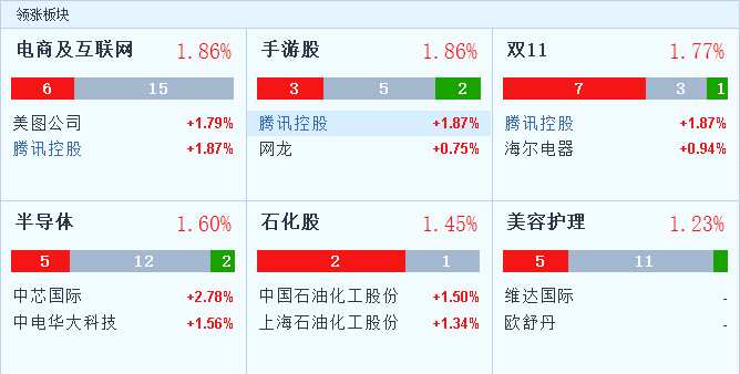 電商及互聯(lián)網(wǎng)、手游、半導(dǎo)體等板塊領(lǐng)漲。