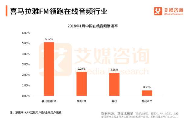 官方公布的數(shù)據(jù)顯示,喜馬拉雅目前總用戶規(guī)模突破4.7億,平臺內(nèi)共有500萬主播,其中包括20萬名認(rèn)證主播;市場占有率為73%,活躍用戶日均收聽時長超過135分鐘。今年4月,艾媒咨詢發(fā)布的《2017-2018中國在線音頻市場研究報告》顯示,2018年1月中國在線音頻滲透率(App活躍用戶數(shù)/全網(wǎng)用戶規(guī)模)排行榜中,喜馬拉雅FM以5.12%的滲透率排名第一,繼續(xù)領(lǐng)跑中國在線音頻行業(yè)。