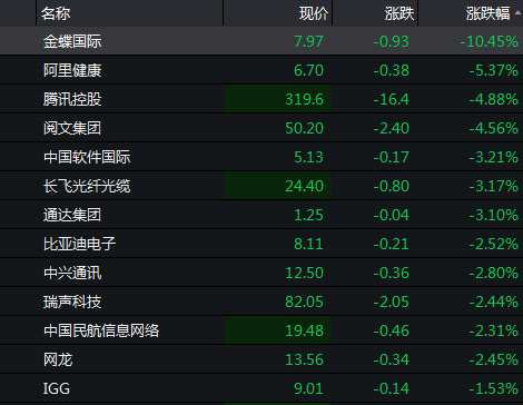科技股再度領(lǐng)跌,板塊跌幅超4%。云服務(wù)巨頭金蝶國(guó)際跌超10%。騰訊開(kāi)盤(pán)大跌4.8%。閱文集團(tuán)、阿里健康跌幅均超過(guò)4%。小米集團(tuán)跌破16港元,刷新上市以來(lái)新低。