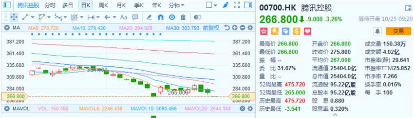 騰訊控股開盤大跌超3%,現(xiàn)報(bào)266.8港元,成交量超150萬,成交額超4億港元。進(jìn)入10月以來,騰訊已經(jīng)累跌超16%。