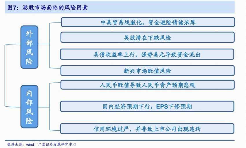 但廖凌同時指出,需要警惕港股市場面臨的多重風(fēng)險因素,比如外部風(fēng)險:中美貿(mào)易摩擦導(dǎo)致資金避險情緒濃厚,美股潛在下跌風(fēng)險,美債收益率上行,強勢美元導(dǎo)致資金流出,以及新興市場貨幣貶值風(fēng)險等,而面臨的內(nèi)部風(fēng)險主要為:人民幣貶值導(dǎo)致人民幣資產(chǎn)預(yù)期趨淡,國內(nèi)經(jīng)濟增長預(yù)期下行,EPS(每股盈余)下修預(yù)期,信用環(huán)境過嚴(yán)致上市公司出現(xiàn)違約等。