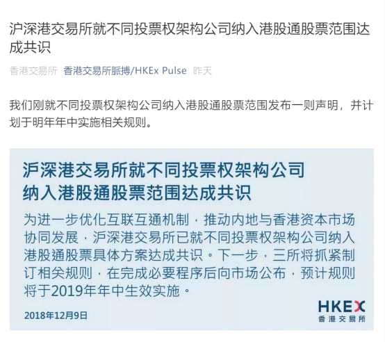 12月9日,兩地三家交易所(上交所、深交所及港交所)同步發(fā)布聲明,表示為進(jìn)一步優(yōu)化互聯(lián)互通機(jī)制,推動(dòng)內(nèi)地與香港資本市場(chǎng)協(xié)同發(fā)展,滬深港交易所已就不同投票權(quán)架構(gòu)公司納入港股通股票具體方案達(dá)成共識(shí)。