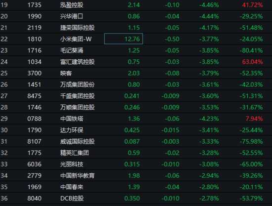 小米跌3.77%,映客跌3.79%、毛記葵涌跌3.85%,中國鐵塔跌4.23%。