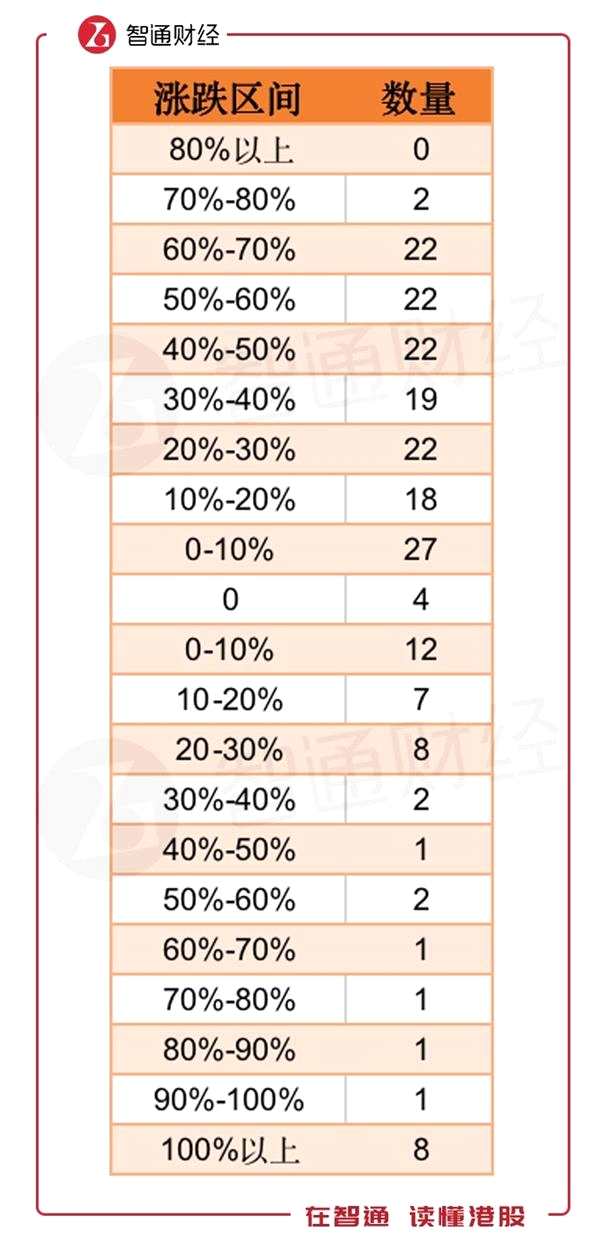 具體來看,這154只破發(fā)的新股中,跌幅最大為愛世紀集團(08507),達77.07%。跌幅超過70%的,還有環(huán)球印館(08448)70%。跌幅在60%-70%之間的新股共有22只,包括匯安智能、ZC TECH GP、江蘇創(chuàng)新等;跌幅在50%-60%之間的新股共有22只,包括森浩集團、希望教育、英記茶莊集團等;跌幅在40%-50%的新股共有22只,光大永年、天立教育、元力控股等;跌幅在30%-40%的新股共有19只,包括駿溢環(huán)球金融、光麗科技、龍資源等;跌幅在20%-30%的新股共有22只,包括博奇環(huán)保、MOS HOUSE、俊裕地基等。