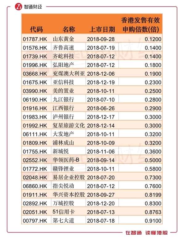 除了新股的市場表現(xiàn)并不樂觀之外,自6月份開始,新股公開認購不足情況也開始不斷涌現(xiàn)。據(jù)智通財經(jīng)統(tǒng)計,在新股IPO中,7月份多達8家公開認購不足,10月份和12月份分別為4家和6家,全年累計達到22家;而且,公共認購比例最低的前五家均不到20%,公開認購比例最低的為【山東黃金(600547)、股吧】(19.34, 0.24,1.26%)礦業(yè),認購比例僅為12%。