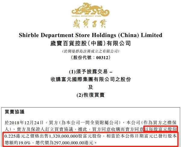 復(fù)牌公告顯示,歲寶百貨擬以每股0.225港元合計(jì)2.97億港元入股富元國(guó)際,相當(dāng)于富元已發(fā)行股本總額約19%。