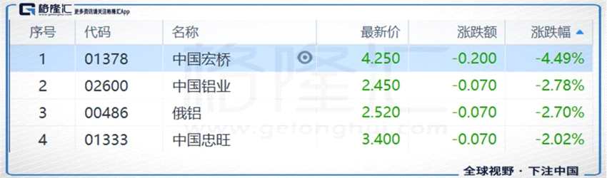 鋁板塊快速下跌中國(guó)宏橋跌3.15%