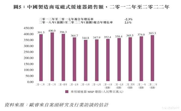 中國市場方面,由于新能源汽車產(chǎn)量劇增而新能源汽車不需要緩速器幫助減速,導(dǎo)致車用緩速器銷售額下降,于2014年達(dá)到3.943億元。其后,車用緩速器制造商找到適合新能源汽車的車用緩速器的兼容方式進(jìn)行技術(shù)突破后,下降趨勢中止。2017年,中國車用緩速器制造商的總銷售額反彈至人民幣347.9百萬元,開始實現(xiàn)正增長,預(yù)計2018年至2022年中國制造商電磁式緩速器銷售額復(fù)合年增長率將達(dá)到2.1%。