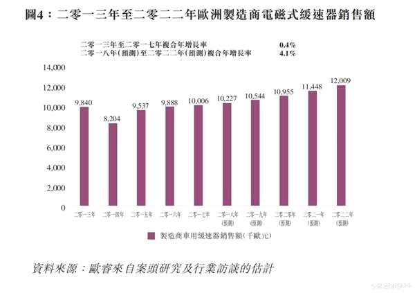 根據(jù)歐瑞的報告,歐洲的電磁式緩速器2013年至2017年銷售額以0.4%的復(fù)合年增長率增長,預(yù)計2018年至2022年將進(jìn)一步以4.1%的