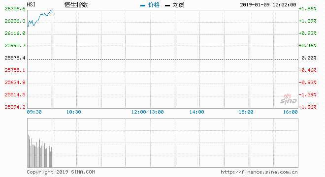 1月9日消息,美股周二收高,錄得連續(xù)第三個(gè)交易日上漲,道指上漲超過256點(diǎn)。對貿(mào)易談判的樂觀預(yù)期推動(dòng)美股上揚(yáng)。投資者正等待特朗普將在美東時(shí)間周二晚上黃金時(shí)段發(fā)表的講話。今日開盤,恒生指數(shù)高開1.4%重返26000點(diǎn),此后漲幅進(jìn)一步擴(kuò)大,截至發(fā)稿,恒指漲1.72%,報(bào)26318點(diǎn);國企指數(shù)漲2.01%,報(bào)10337點(diǎn)。