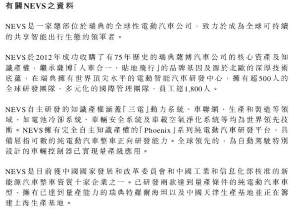 資料顯示,NEVS總部位于瑞典,擁有極深的工業(yè)基礎(chǔ),這是因為其于2012年成功收購了有75年歷史的瑞典薩博汽車公司的核心資產(chǎn)和知識產(chǎn)權(quán),完全繼承薩博的品牌基因及源于北歐的深厚技術(shù)底蘊(yùn)。