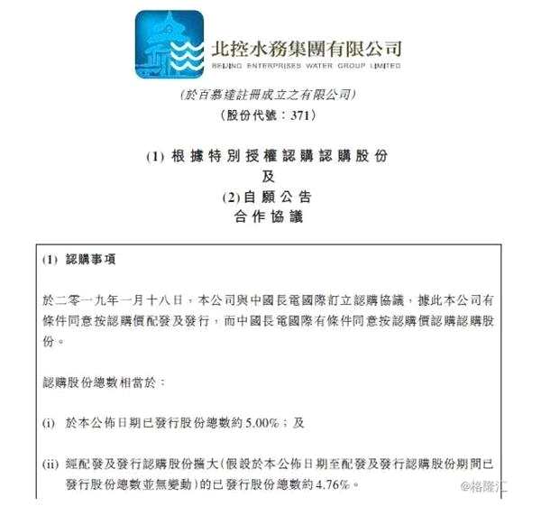 1)最終認購北控水務集團股份的是長江環(huán)保集團,長江環(huán)保集團是三峽集團的全資子公司;由于目前長江環(huán)保集團的境外投資平臺未完成設立,所以先由長江電力認購新股,待長江環(huán)保設立好境外投資平臺,再由長江電力轉讓給長江環(huán)保集團。