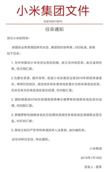 1月19日,小米內(nèi)部發(fā)布任命文件,成立非洲地區(qū)部,拓展非洲業(yè)務,由副總裁汪凌鳴負責,向小米高級副總裁王翔匯報。這意味著小米正式進入非洲市場。