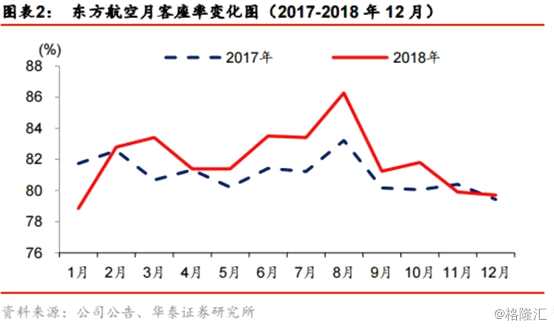 2018全年東航運(yùn)力投放謹(jǐn)慎,同比僅增8.1%;其中國(guó)內(nèi)線因受民航局時(shí)刻緊縮政策影響,同比增8.9%;因?qū)掦w機(jī)引進(jìn)較少,國(guó)際運(yùn)力增速較去年同期縮窄4.1個(gè)百分點(diǎn)至6.8%,顯著低于國(guó)航、南航(國(guó)航、南航2018年同比各增14.1%/13.9%);總需求同比增9.7%,令客座率同比改善1.2個(gè)百分點(diǎn)(南航提升0.2個(gè)百分點(diǎn),國(guó)航下降0.5個(gè)百分點(diǎn))。