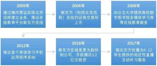 新東方在線是新東方集團(tuán)旗下的一家在線課外教育服務(wù)供應(yīng)商,控股股東是新東方教育集團(tuán)。公司的運(yùn)營實(shí)體北京迅程在2017年3月在全國中小企業(yè)股份轉(zhuǎn)讓系統(tǒng)掛牌,為了本次港股上市公司于2018年2月自愿除牌。以下為公司簡單的發(fā)展歷程: