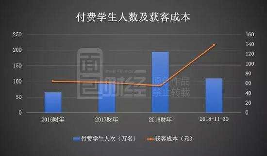 根據(jù)聆訊資料,新東方在線的付費(fèi)學(xué)生人次逐年增多,截止2018年11月30日,新東方在線在6個月里的付費(fèi)學(xué)生人次達(dá)110.4萬名,已超過了2017財年的總付費(fèi)學(xué)生人數(shù)。但與此同時,公司的獲客成本卻出現(xiàn)了大幅度增加。