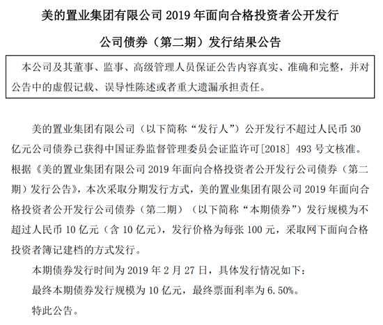 摘要: 美的置業(yè)發(fā)布公告,附屬公司美的置業(yè)集團(tuán)2019年面向合格投資者公開發(fā)行公司債券(第二期)。發(fā)行規(guī)模為不超過人民幣10億元(含10億元),發(fā)行價(jià)格為每張100元。公告顯示,最終本期債券發(fā)行規(guī)模為10億元