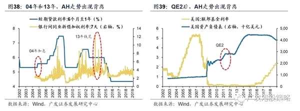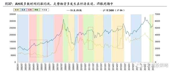 我們復(fù)盤了2002年以來的中國經(jīng)濟周期與AH市場指數(shù)之間的相對表現(xiàn),恒生指數(shù)和滬深300指數(shù)多數(shù)時間同漲同跌,但在經(jīng)濟衰退和滯脹周期中,兩者的相對存在一定差異。這可能與國內(nèi)外貨幣政策和產(chǎn)業(yè)政策環(huán)境的顯著變化有關(guān),代表性案例包括:04年(加息)、13年(錢荒)、11年(美國QE)、15年(杠桿牛)等。