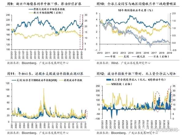 第一,19年初以來,全球主要央行貨幣政策態(tài)度相繼轉(zhuǎn)為更加的“鴿派”,推動包括新興市場在內(nèi)的全球債券收益率同步下行,市場估值得到支撐;