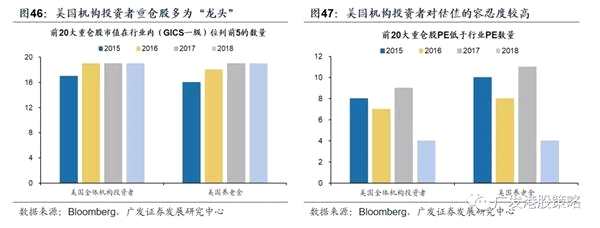 美國機構(gòu)投資者偏好大市值“龍頭”,對估值的容忍度更高。美國機構(gòu)投資者重倉股多為行業(yè)“龍頭公司”,但由于海外龍頭股大多存在“估值溢價”,且較多機構(gòu)重倉的美股科技股估值更高,因此整體來看,美國機構(gòu)投資者偏愛低估值的特征并不明顯。
