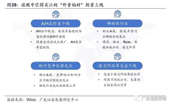 相比A股,港股中值得關(guān)注的“外資偏好”組合 外資在跨市場投資理念存在差異,而AH市場偏好在具體行業(yè)與公司層面也各有所長,相比A股,哪些港股組合可能更受外資偏好?我們梳理出以下四條主線供參考: