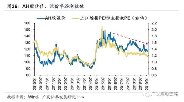 第二,A股和港股兩者的估值體系也越來越接近。AH市場互聯(lián)互通,加速了兩地市場相對估值從發(fā)散到收斂的進程,A股相對港股的估值溢價在收窄。