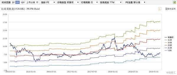 既然紅星美凱龍的店面數(shù)量、營(yíng)收和歸母凈利潤(rùn)是維持長(zhǎng)期上升態(tài)勢(shì),而ROE、銷售毛利和EPS保持住低波的穩(wěn)態(tài)水平,那么近期的估值情況如何?如果拋開圖表,根據(jù)以上證據(jù)我們很容易會(huì)認(rèn)為估值應(yīng)該上揚(yáng),但是,市場(chǎng)投資者普遍擔(dān)心家居行業(yè)的增速放緩問題及紅星美凱龍的杠桿提升問題,帶來了歷史性的低估機(jī)會(huì)。
