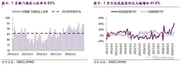 港珠澳大橋的開通進(jìn)一步便利了游客訪澳,19年1月入境澳門旅客人數(shù)同比增長24.9%(內(nèi)地旅客同比增長29.9%),其中不過夜旅客同比大幅增加41.8%,過夜游客同比增長10.7%,旅客平均逗留時(shí)間1.2日。